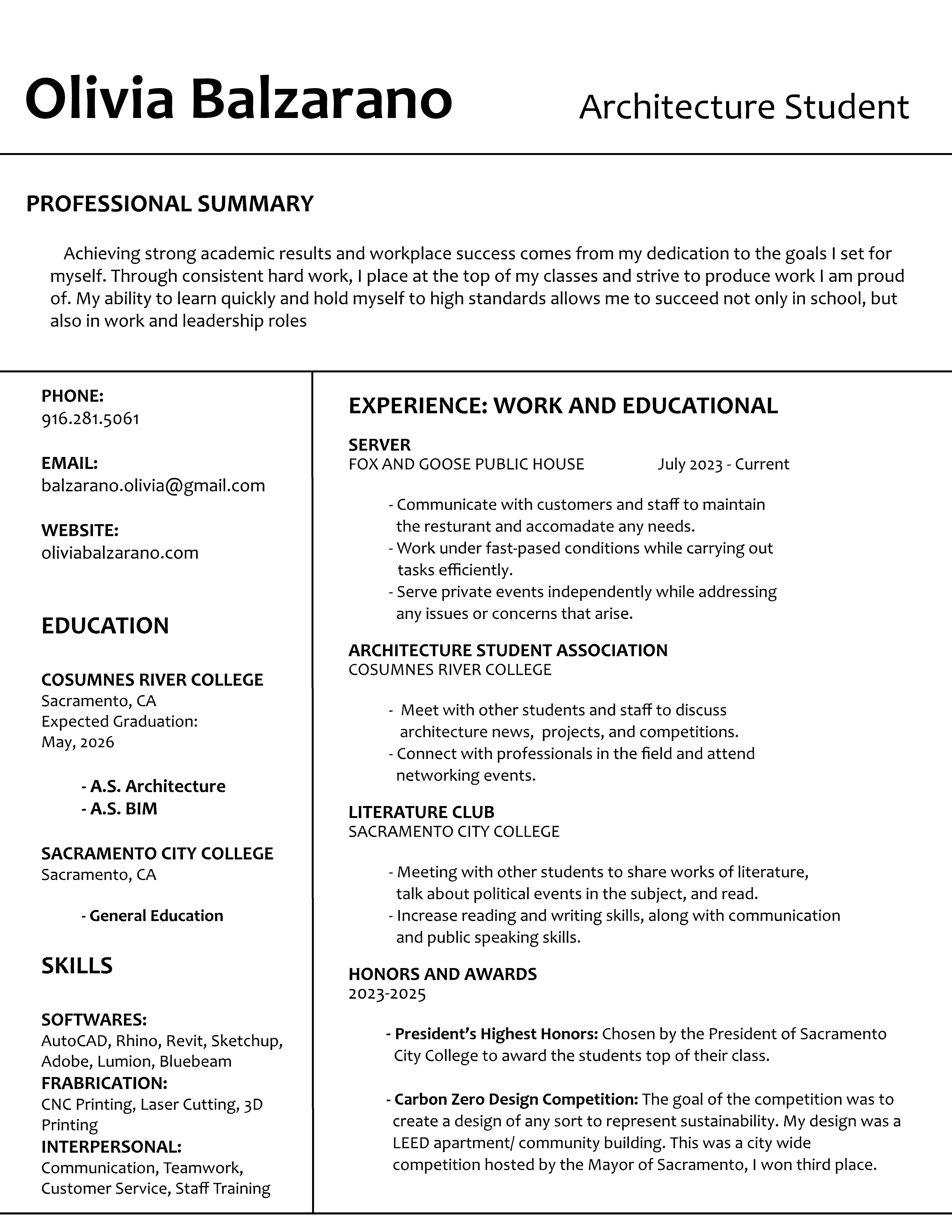 Hi, I'm Olivia Balzarano, a creative and disciplined Architecture student currently attending Cosumnes River College.